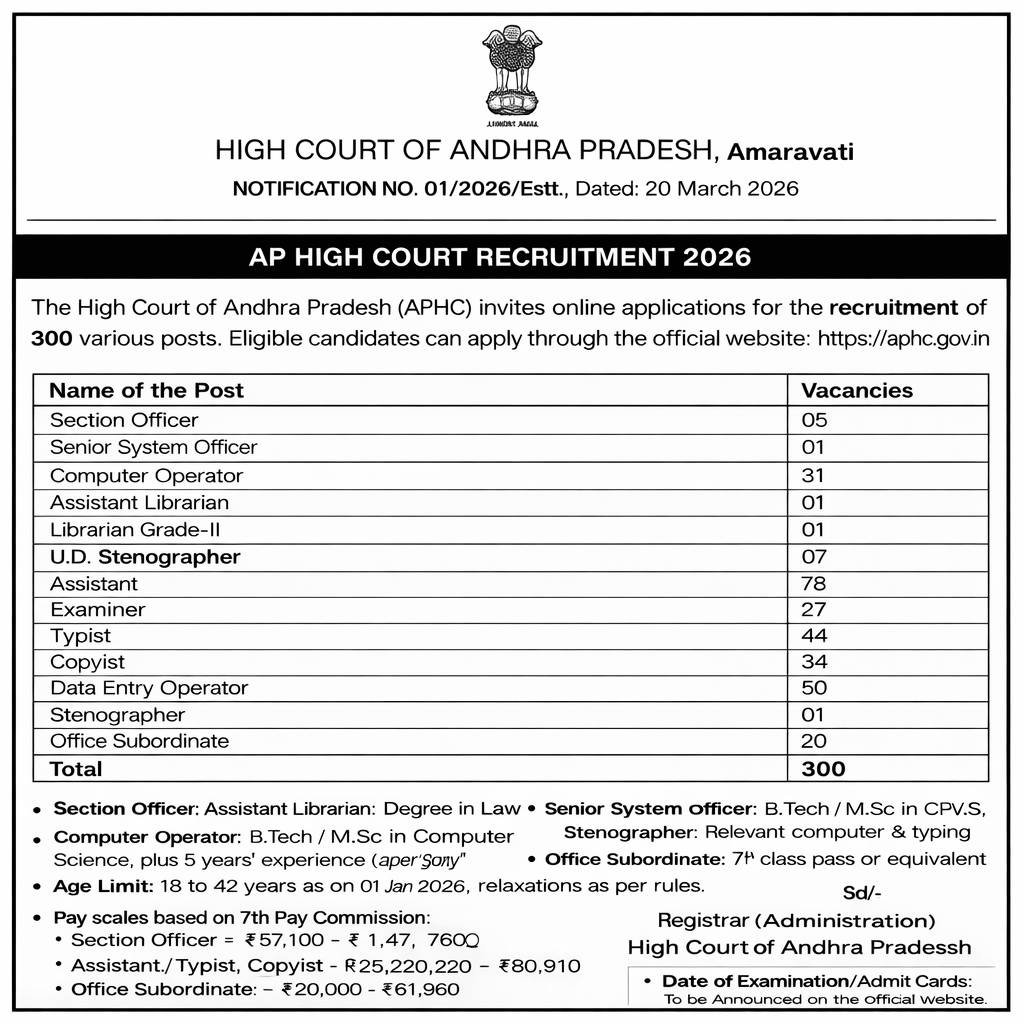 AP High Court Recruitment 2026 – 300 vacancies. Apply online from 30 March to 19 April 2026 at aphc.gov.in. Check eligibility, fees, salary & exam details.