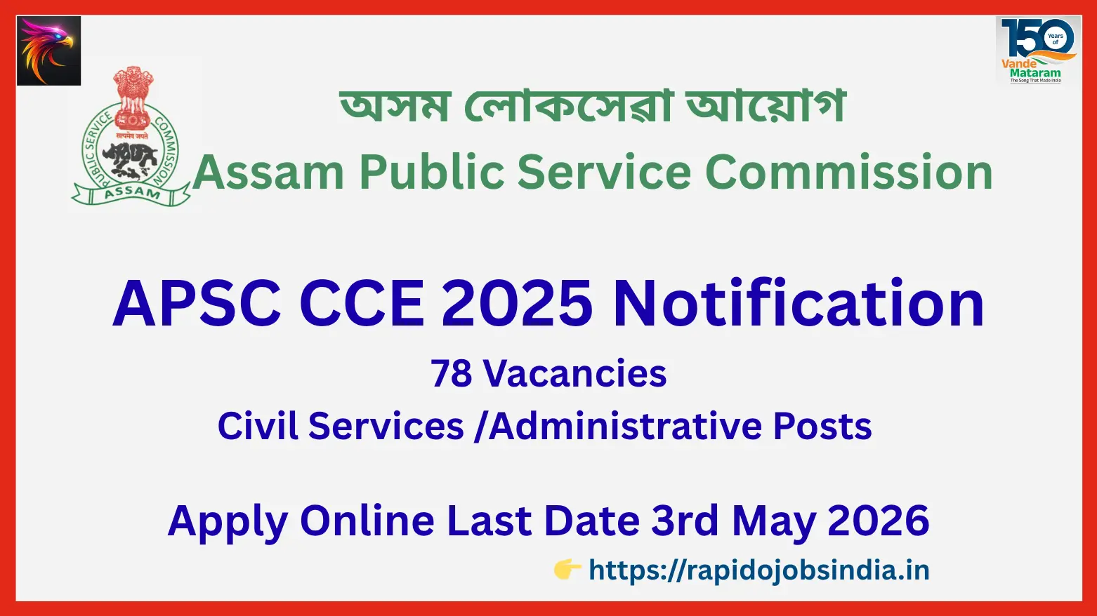 APSC CCE 2025 Notification – 78 Vacancies Civil Services /Administrative Posts, Apply Online Last Date 3rd May 2026