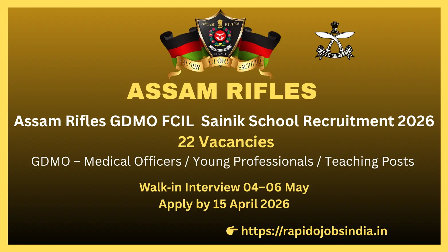 Assam Rifles GDMO, FCIL & Sainik School Recruitment 2026 – 22 Vacancies. Walk‑in 04–06 May, Apply by 15 April 2026. Govt Jobs India.