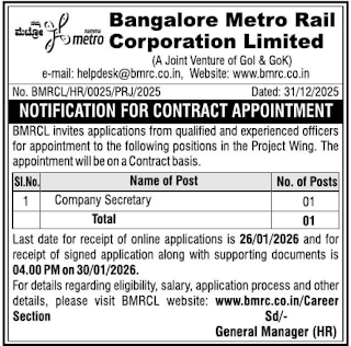 It is a contract appointment by Bangalore Metro Rail Corporation Limited for one Company Secretary post.