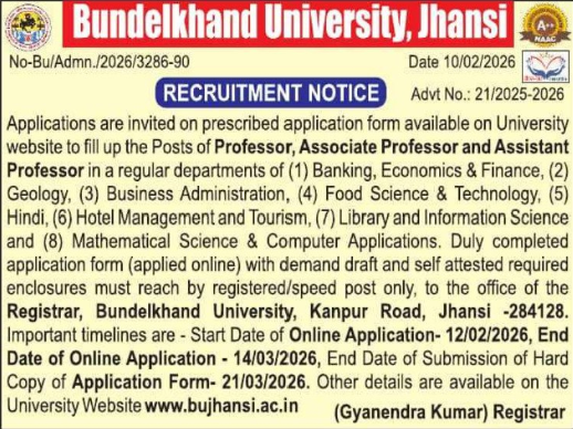 Bundelkhand University Jhansi invites applications for 143 faculty posts under SFS. Apply online by 14 March 2026, hard copy by 21 March 2026.