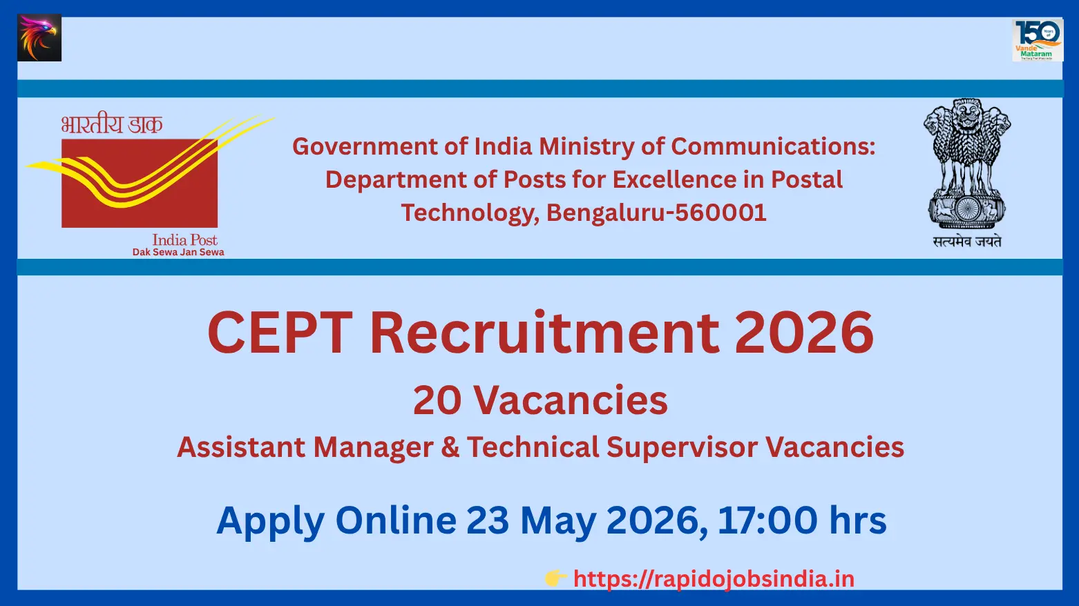 The Centre for Excellence in Postal Technology (CEPT), functioning under the Department of Posts, has officially announced the CEPT Recruitment 2026 notification. This recruitment drive invites applications on a deputation basis for the positions of Assistant Manager and Technical Supervisor. With postings available across CEPT units in Mysuru, Chennai, Bengaluru, Hyderabad, Mumbai, Patna, Kochi, and Visakhapatnam, the opportunity provides a nationwide scope for eligible candidates.