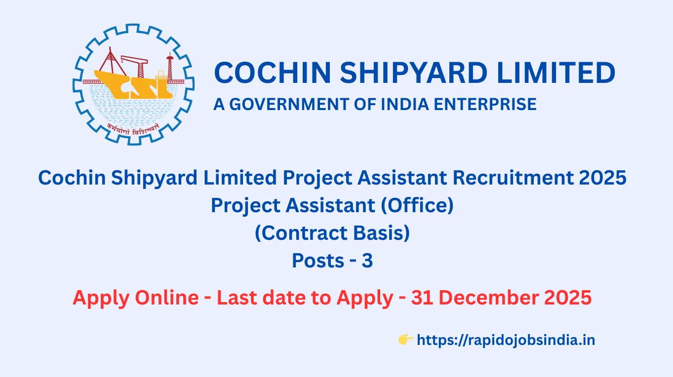Cochin Shipyard Limited Project Assistant Recruitment 2025, Posts – 3, Last date – 31 Dec 25