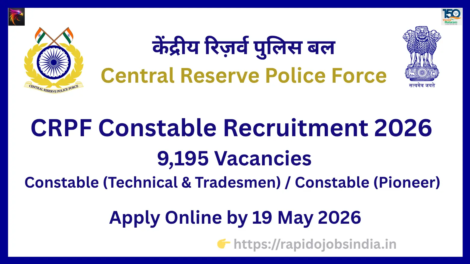• CRPF Constable Recruitment 2026 – 9,195 Vacancies Apply Online by 19 May 2026
