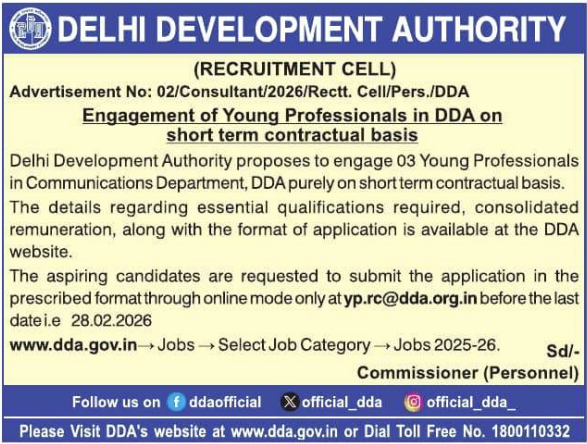 DDA invites applications for 03 Young Professionals in Communications Dept. Last date 28 Feb 2026. Salary ₹65,000/month. Apply via email.