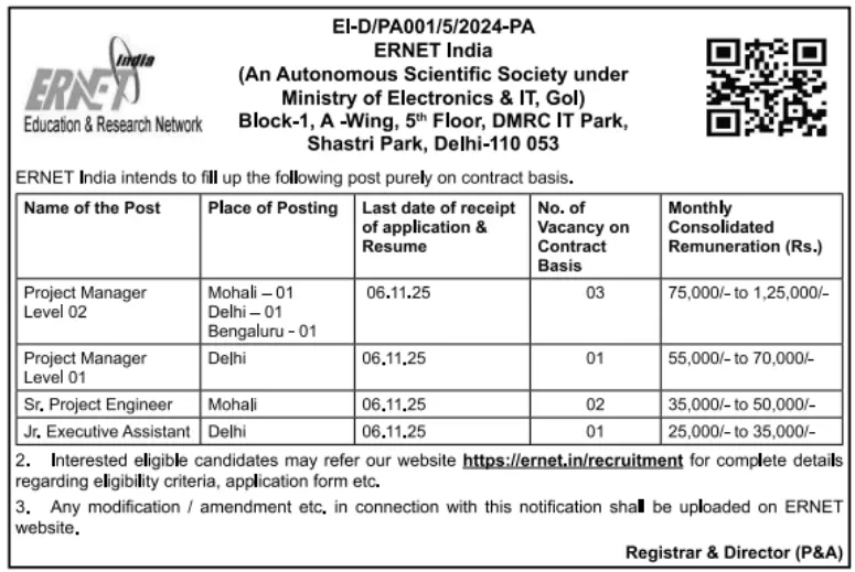 ERNET India Recruitment 2025 – 08 Posts | ICT & Data Centre Project; Last date 6 Nov 2025
