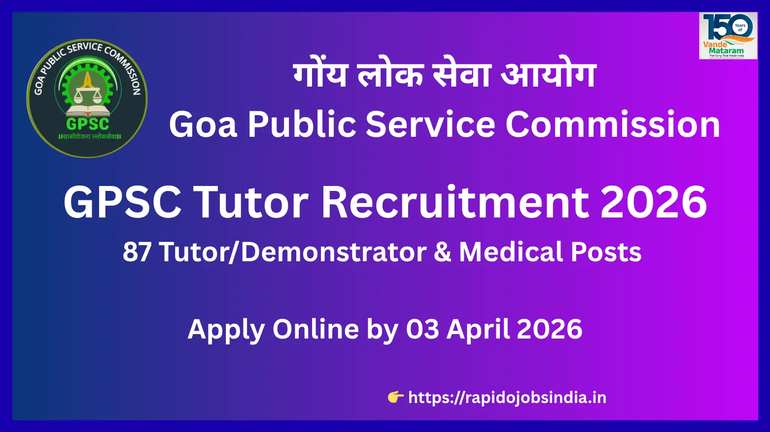 Apply for 87 Tutor/Demonstrator & Medical posts at Goa PSC. Online applications open till 03 April 2026.