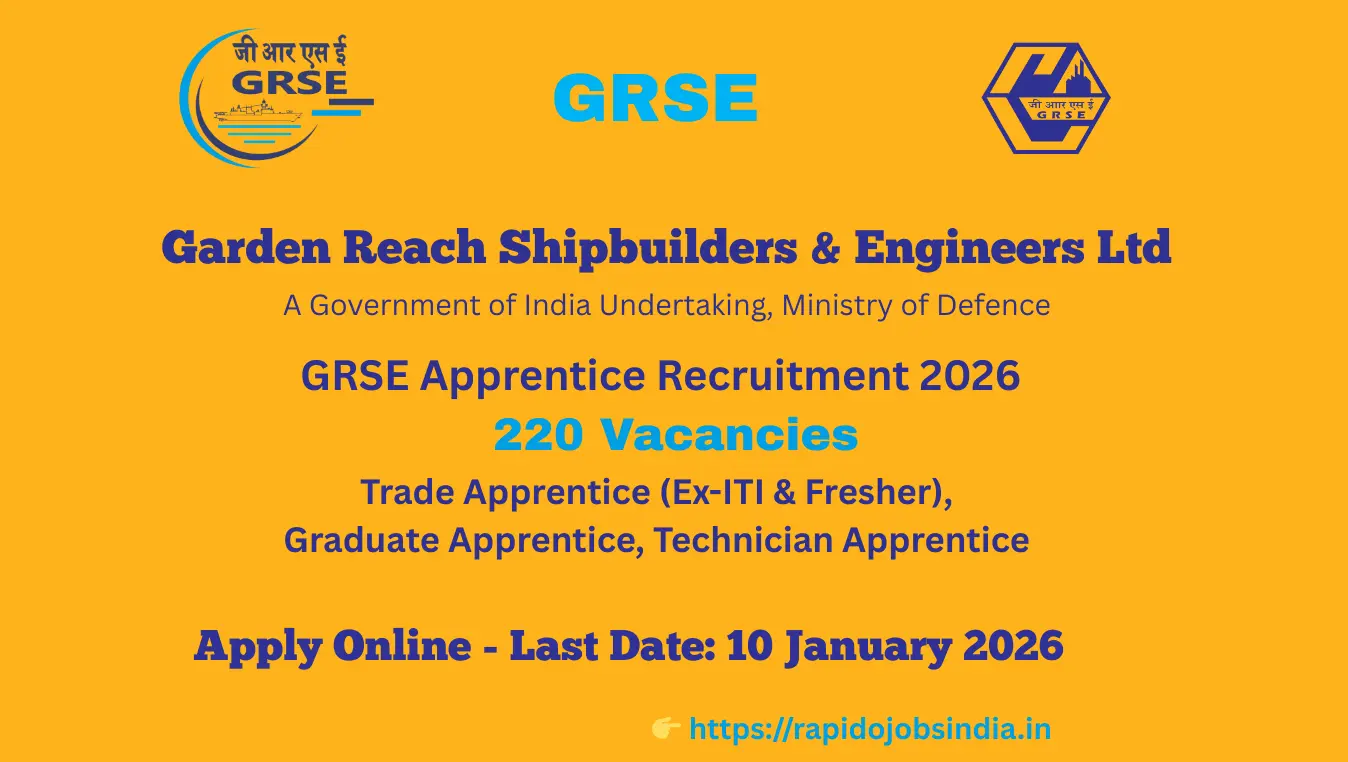 GRSE Apprentice Recruitment 2026, 220 Vacancies, Apply Online Last date 10 Jan 2026