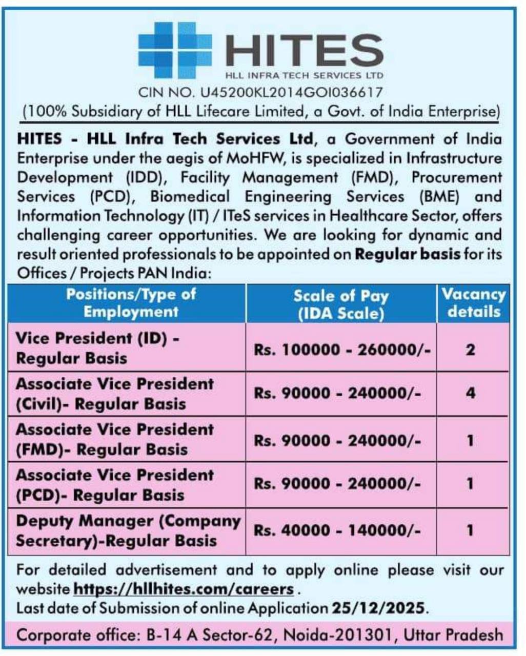 HITES – HLL Infra Tech Services Ltd, a Government of India enterprise and a 100% subsidiary of HLL Lifecare Limited, specializes in Infrastructure Development (IDD), Facility Management (FMD), Procurement Services (PCD), Biomedical Engineering (BME) and IT/ITeS services in the healthcare sector. The company has announced HITES Recruitment 2025-26 for 09 regular vacancies including Vice President (ID), Associate Vice President (Civil/FMD/PCD) and Deputy Manager (Company Secretary) for its offices and projects across PAN India. Interested and eligible candidates can apply online through the official HITES careers portal on or before 25 December 2025.