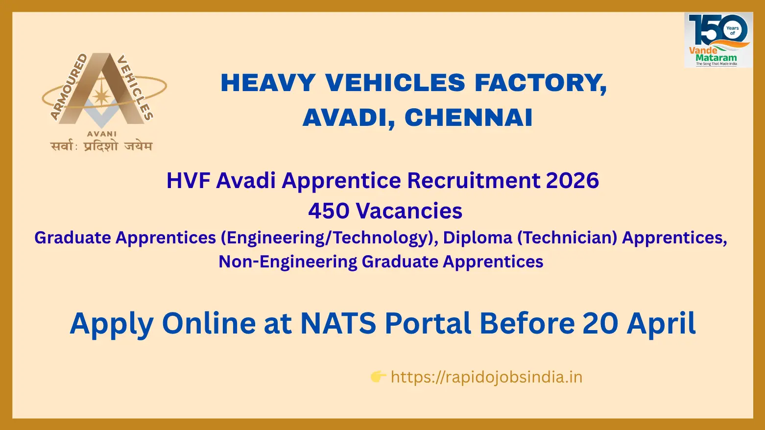 HVF Avadi Apprentice Recruitment 2026 – 450 Vacancies, Apply Online at NATS Portal Before 20 April 2026