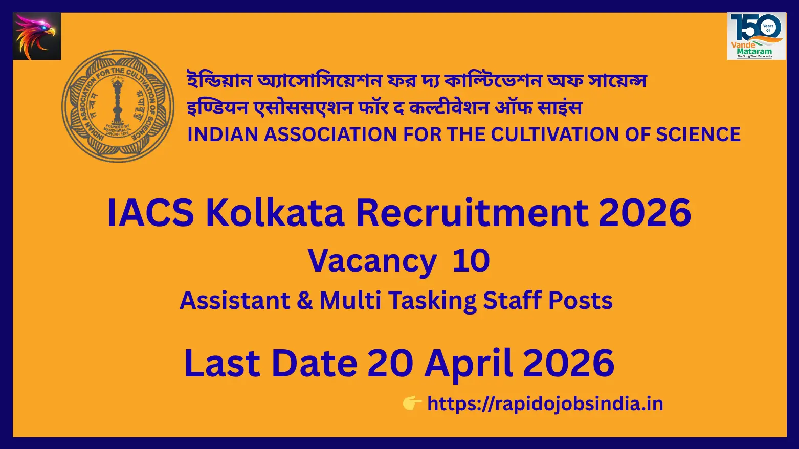 • IACS Kolkata Recruitment 2026 – 10 Assistant & MTS Posts Last Date 20 April 2026