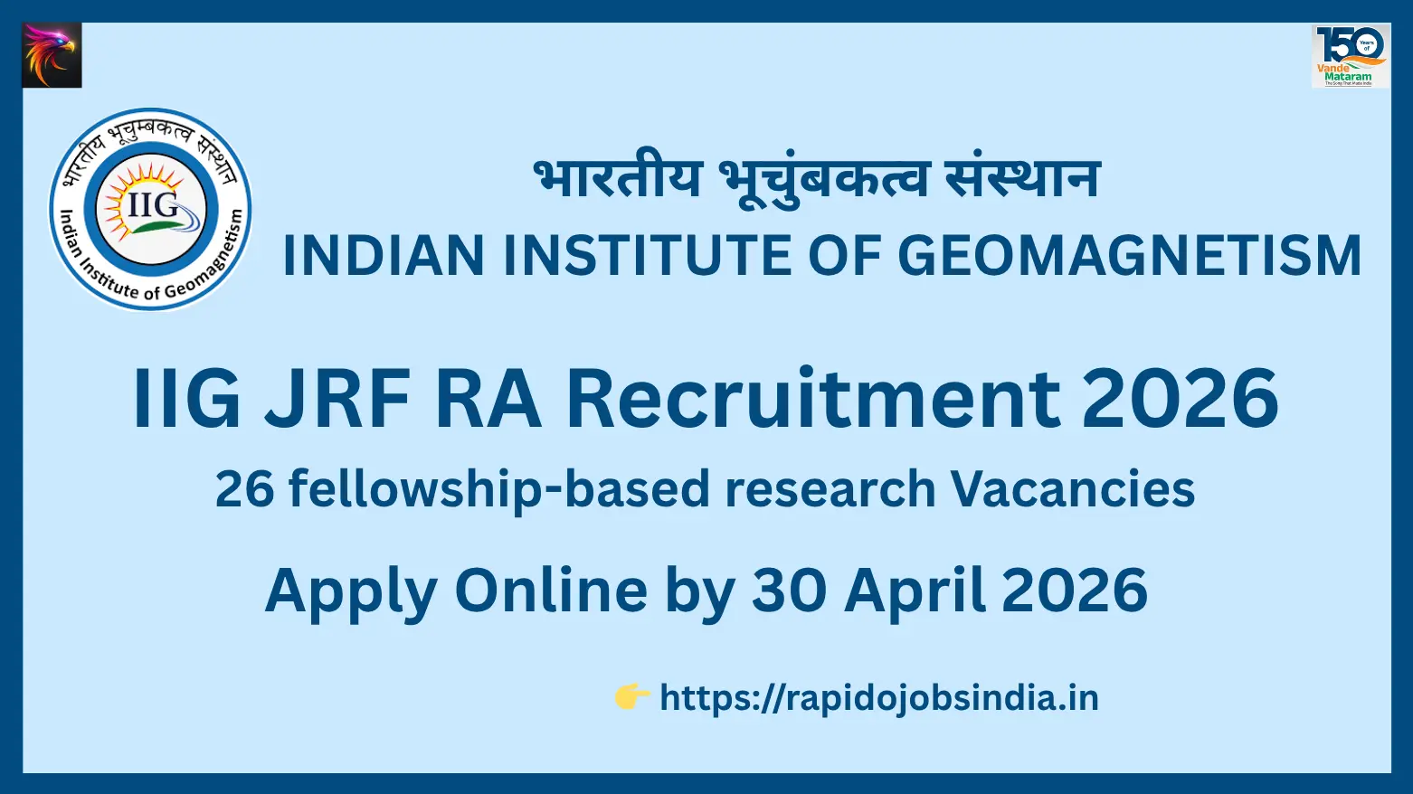 There are 26 fellowship-based research vacancies at the Indian Institute of Geomagnetism (IIG).