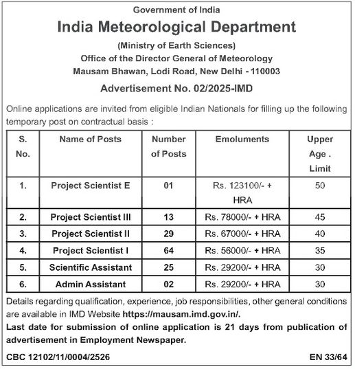 The India Meteorological Department (IMD), operating under the Ministry of Earth Sciences, Government of India, has announced a nationwide recruitment drive for the engagement of Project Scientists (E, III, II, I), Scientific Assistants, and Administrative Assistants. These roles are offered on a contractual basis to support critical Research & Development initiatives in meteorology and allied scientific domains.