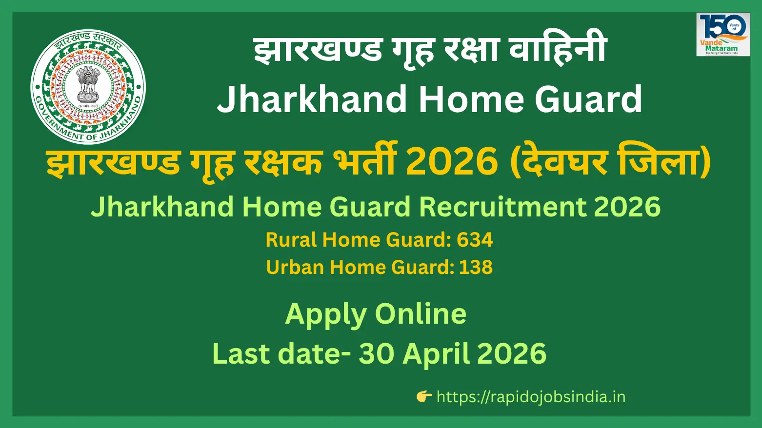 Jharkhand Home Guard Recruitment 2026 – 772 Vacancies in Deoghar District. Apply online before 30 April 2026. Eligibility: 7th/10th Pass, Age 19–40 years.