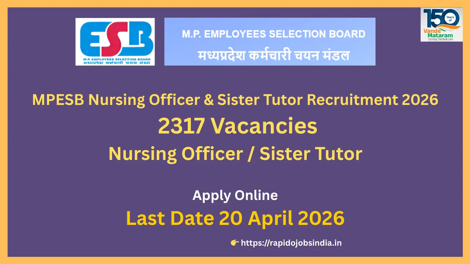 • MPESB Nursing Officer & Sister Tutor Recruitment 2026 – 2317 Vacancies Apply Online by 20 April 2026
