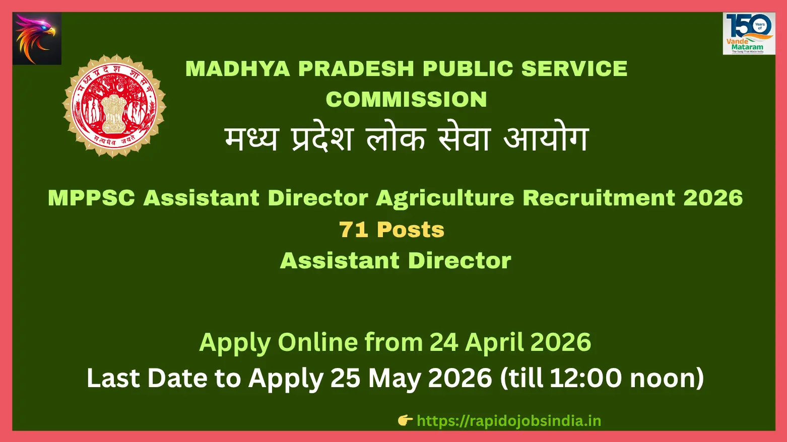 The Madhya Pradesh Public Service Commission (MPPSC) has announced the Assistant Director Agriculture Recruitment 2026, offering opportunities for candidates with strong agricultural qualifications. Applications will be accepted online from 25 April 2026 to 24 May 2026, ensuring ample time for interested applicants to register and prepare.