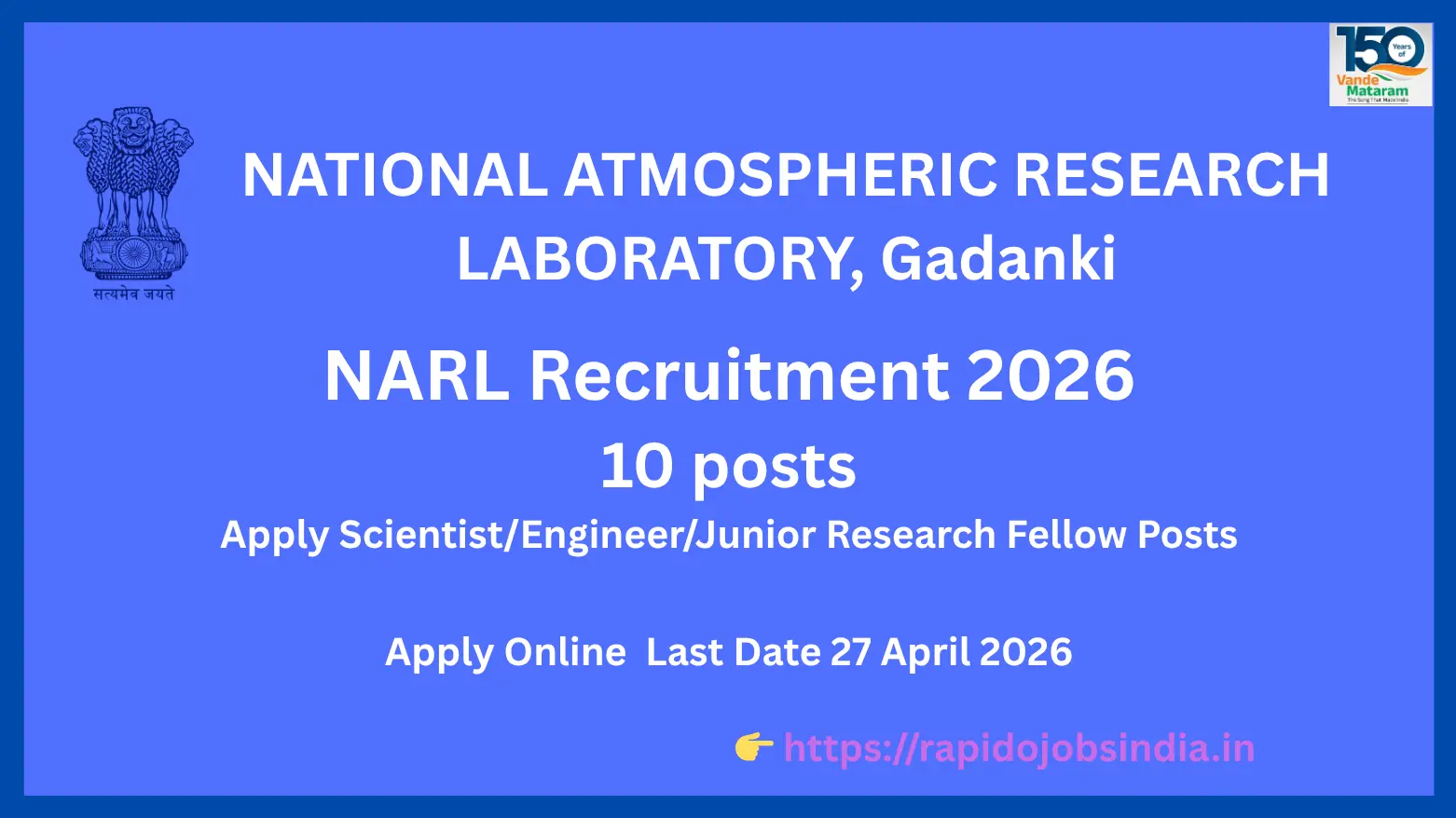 • NARL Recruitment 2026: Apply Scientist/Engineer / Junior Research Fellow Posts ; Last Date 27 April 2026