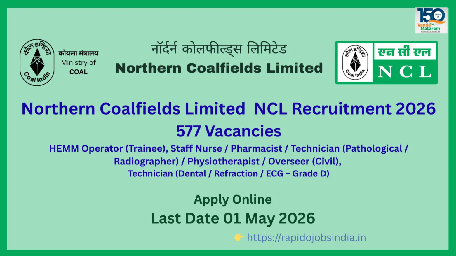 Northern Coalfields Limited (NCL), a Miniratna company under Coal India Limited, has released its 2026 recruitment notification offering 577 vacancies. These include positions for HEMM Operator (Trainee), Paramedical Staff in various categories, and Overseer (Civil). The recruitment drive aims to strengthen operations across mines, hospitals, and establishments located in Singrauli, Madhya Pradesh, and Sonbhadra, Uttar Pradesh. Candidates can apply online between 09 April 2026 and 01 May 2026.