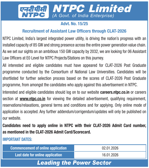 NTPC Limited, India’s largest integrated power utility, invites online applications for 06 Assistant Law Officers (E0 Level) for NTPC Projects/Stations. Candidates must have appeared for CLAT-2026 Post Graduate programme conducted by the Consortium of NLUs. Shortlisting will be based on CLAT-2026 PG scores among candidates who apply to NTPC. Applications are accepted only online via the NTPC careers portal from 02 January 2026 to 16 January 2026. Addendum/corrigendum/updates will be published on NTPC’s website.