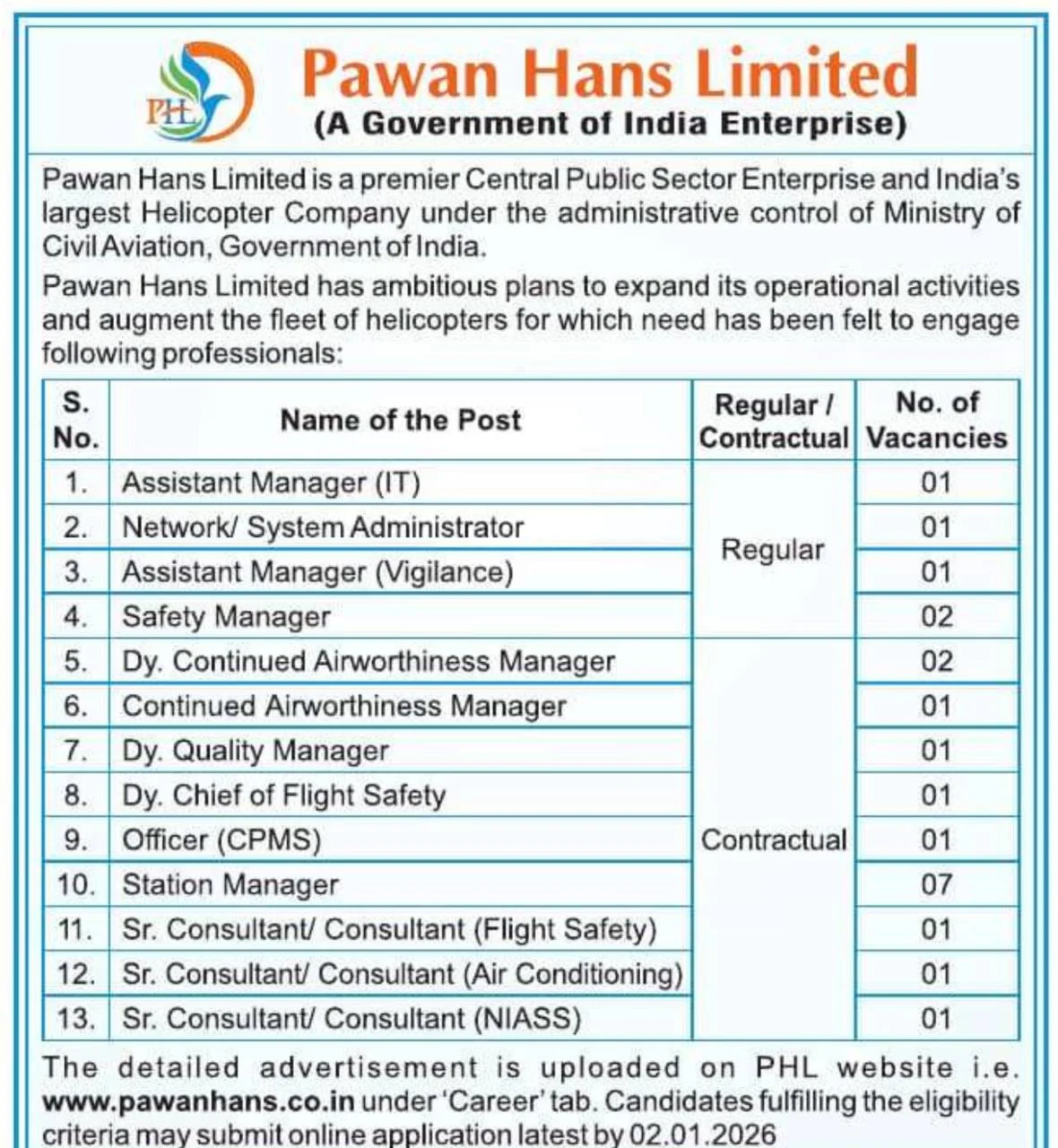 The detailed notification is available on the Pawan Hans Limited website under the ‘Career’ section.
