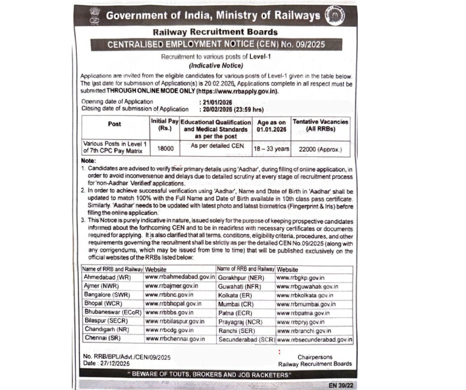 | The Railway Recruitment Boards (RRB) will recruit for various Level-1 posts under Group D through CEN 09/2025. Applications are accepted online only at rrbapply.gov.in from 21 January to 20 February 2026 (23:59 hrs). The indicative notice lists 22000 vacancies with initial pay of ₹18,000 under the 7th CPC Level-1. Eligibility, medical standards, selection stages, and post-wise details will be specified in the detailed CEN. Candidates are advised to verify Aadhaar and ensure Class 10 certificate details match their Aadhaar for seamless verification. |