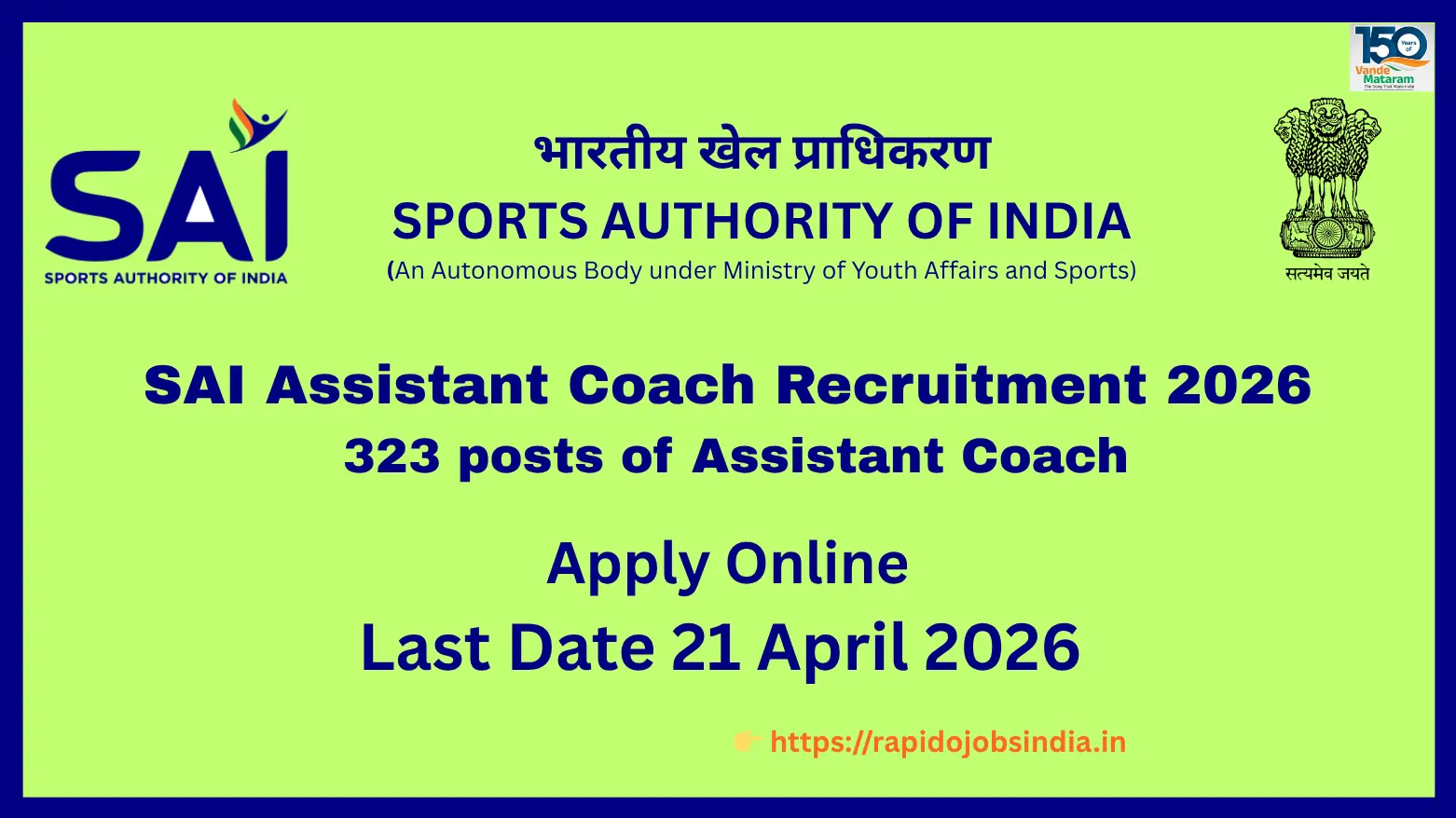 • SAI Assistant Coach Recruitment 2026 – Apply Online, 323 posts of Assistant Coach Last Date 21 April 2026