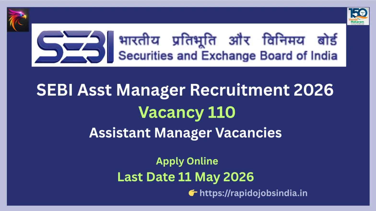 SEBI invites applications for 110 Assistant Manager posts. Apply online before 11 May 2026. Salary approx ₹1.84 lakh per month.
