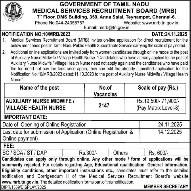It is a direct recruitment drive by Tamil Nadu MRB for 2147 posts of Auxiliary Nurse Midwife / Village Health Nurse for women candidates.