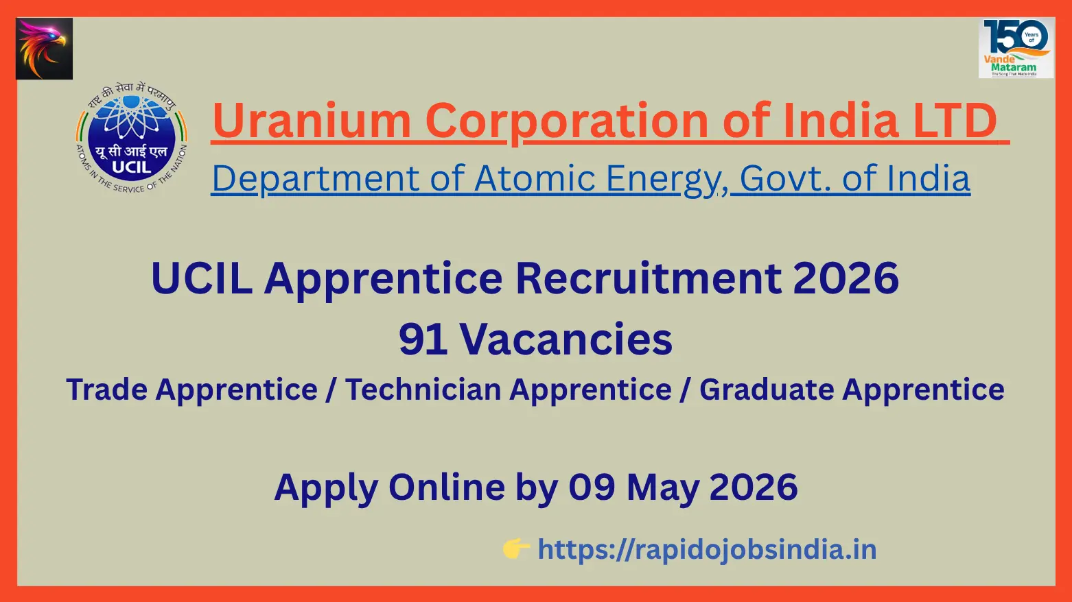 Uranium Corporation of India Limited (UCIL), a Government of India Enterprise, has released its 2026 apprenticeship notification offering 91 vacancies across ITI, Diploma, and Graduate disciplines. The recruitment drive is for the Tummalapalle unit in Kadapa, Andhra Pradesh, with applications accepted exclusively online until 09 May 2026.