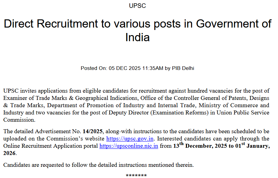 The Union Public Service Commission (UPSC), India’s foremost central recruitment authority, has announced Advertisement No. 14/2025 for direct recruitment to 102 high-profile posts. This includes 100 Examiner of Trade Marks & Geographical Indications positions in the Office of the Controller General of Patents, Designs & Trade Marks under the Department for Promotion of Industry and Internal Trade, Ministry of Commerce & Industry, along with 2 Deputy Director (Examination Reforms) posts within UPSC itself.
