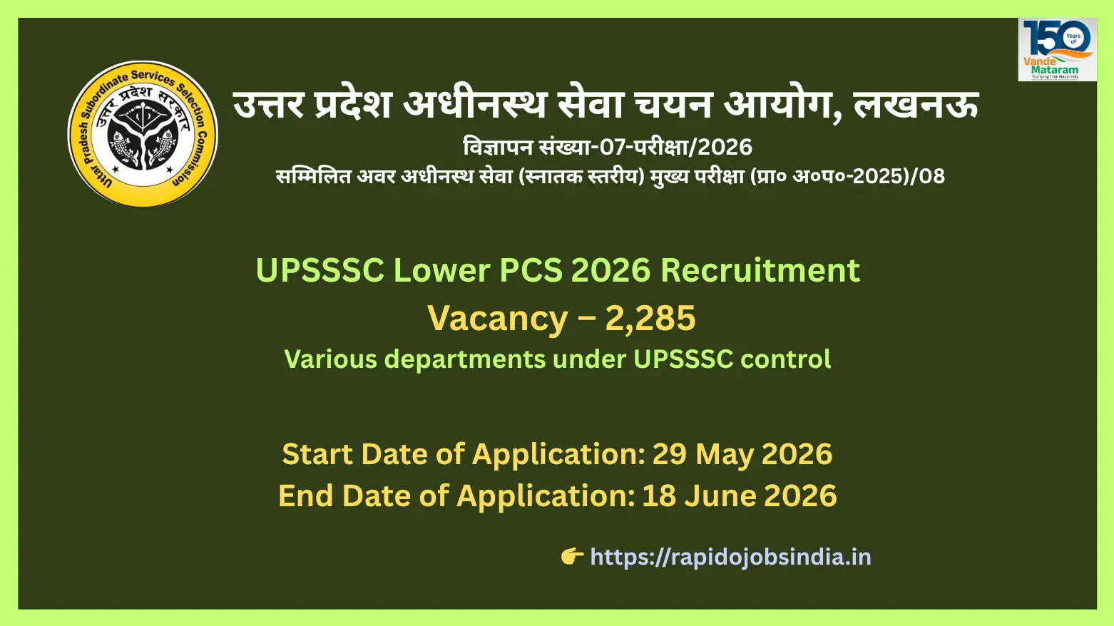 The detailed notification is available at rapidojobsindia.in and the UPSSSC official website.
