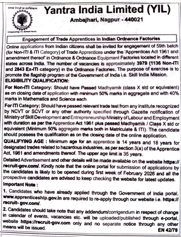 Yantra India Limited invites online applications for 59th batch Trade Apprentices (Non‑ITI & ITI). 3979 vacancies. Portal opens early Feb; last date late Feb 2026.